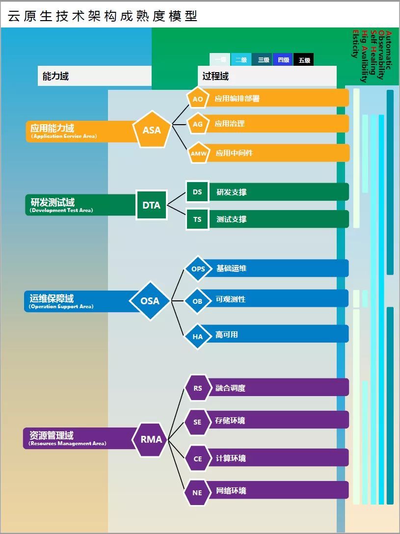 云原生业务应用综合成熟度水平分为5级,分别为初始级(非云)、基础级(架构弹性)、全面级(服务解耦)、优秀级(应用自愈)以及卓越级(持续优化)。