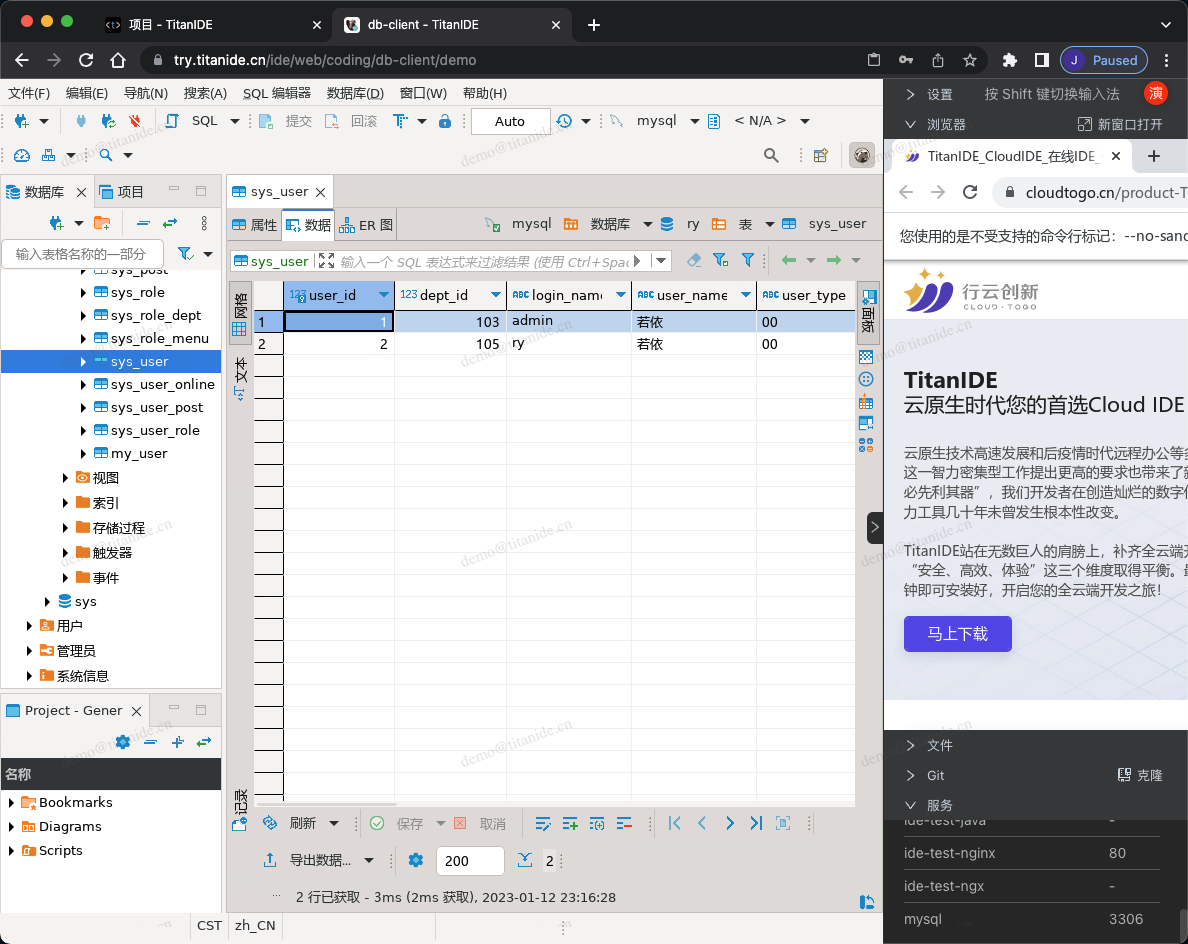 以 MySQL 为例,TitanIDE 在工作区已经集成了mysql命令行客户端,输入以下命令即可。
