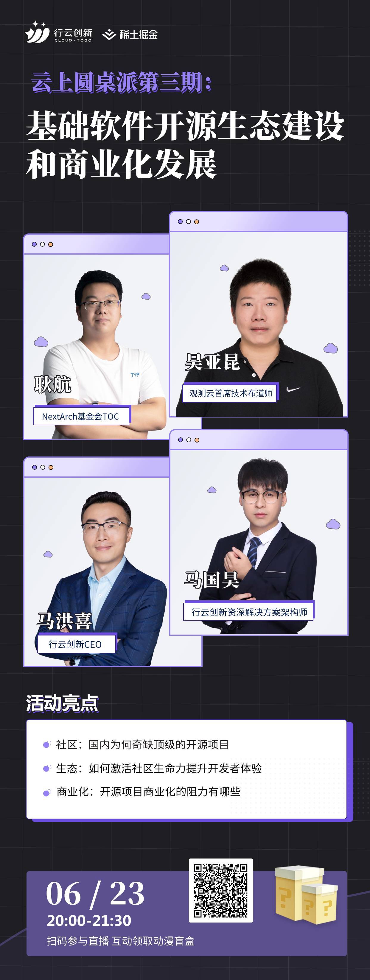 6月23日晚上20:00,云上圆桌派第三期《基础软件开源生态建设和商业化发展》即将开启,活动邀请NextArch基金会TOC耿航,观测云首席技术布道师吴亚昆,开元体育创新资深解决方案架构师马国昊三位大咖和开元体育创新CEO马洪喜一起对国内的开源生态现状、社区的建设及商业化发展等多个问题一起展开讨论。